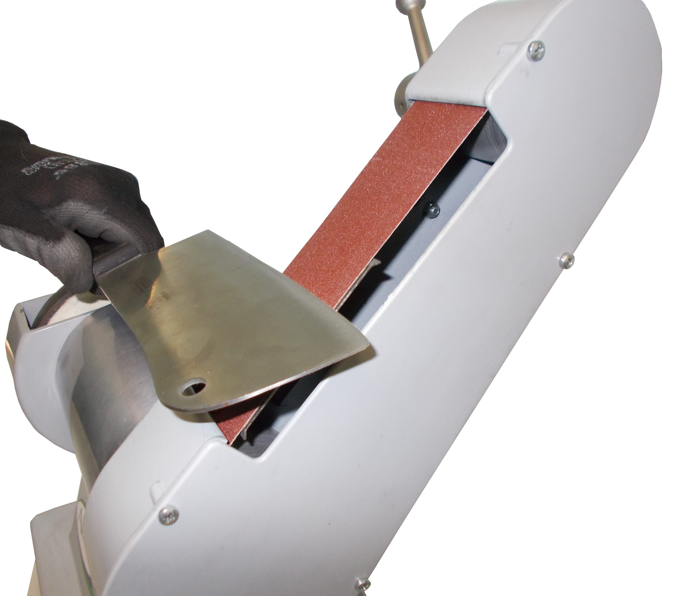 Die Filzscheibe mit Schleifpaste beschichtete kann für Präzisionsentgratarbeiten verwendet werden; Das Schleifband ermöglicht die Bearbeitung der Schneidkante und des Klingenaustrittswinkels dank der 2 Arbeitspositionen auf dem Schleifband: oben flexibel und unten starr und gestützt.
